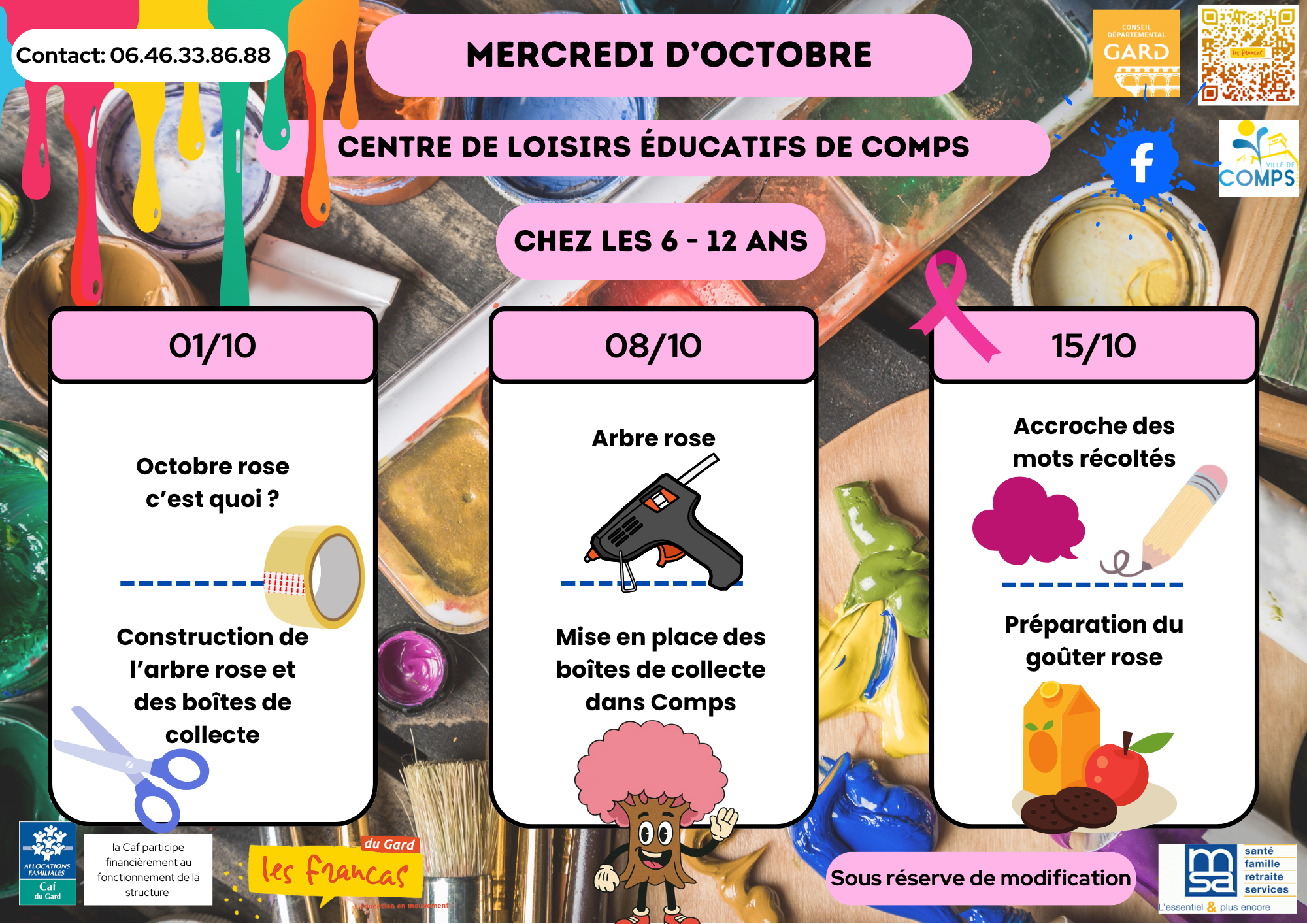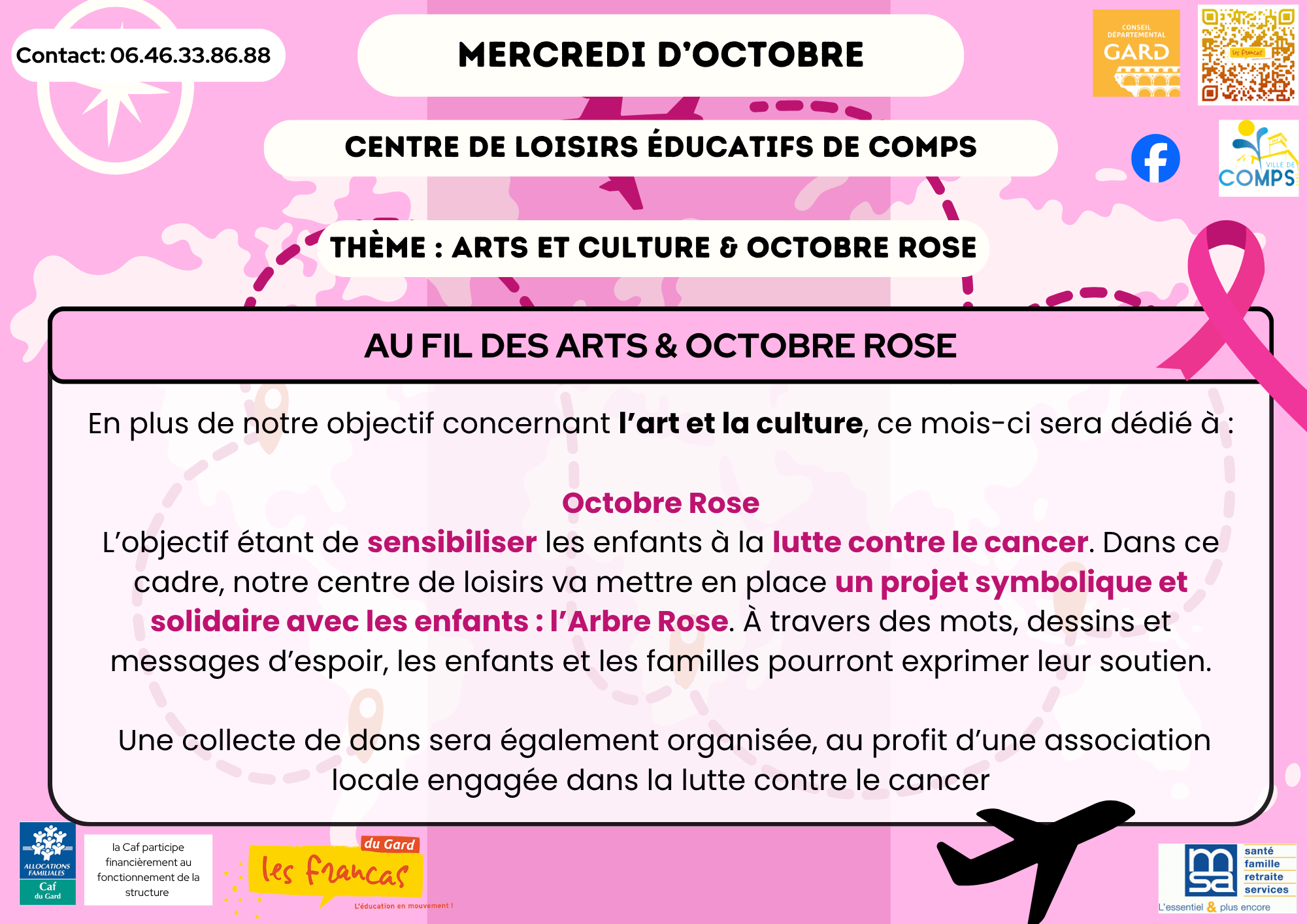 > Pour les enfants de 6-12 ans, tout le mois sera consacré à un projet solidaire : l’Arbre Rose, mené dans le cadre d’Octobre Rose. Les enfants participeront à la création d’un grand arbre dont le feuillage sera composé de mots, dessins et messages de soutien destinés aux personnes touchées par le cancer.