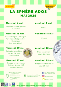 Nous avons le plaisir de vous présenter la programmation de la sphère ados de Sommières et Congénies pendant le mois mai :