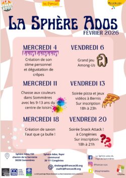 Nous avons le plaisir de vous présenter la programmation de la sphère ados de Sommières et Congénies pendant le mois de février :