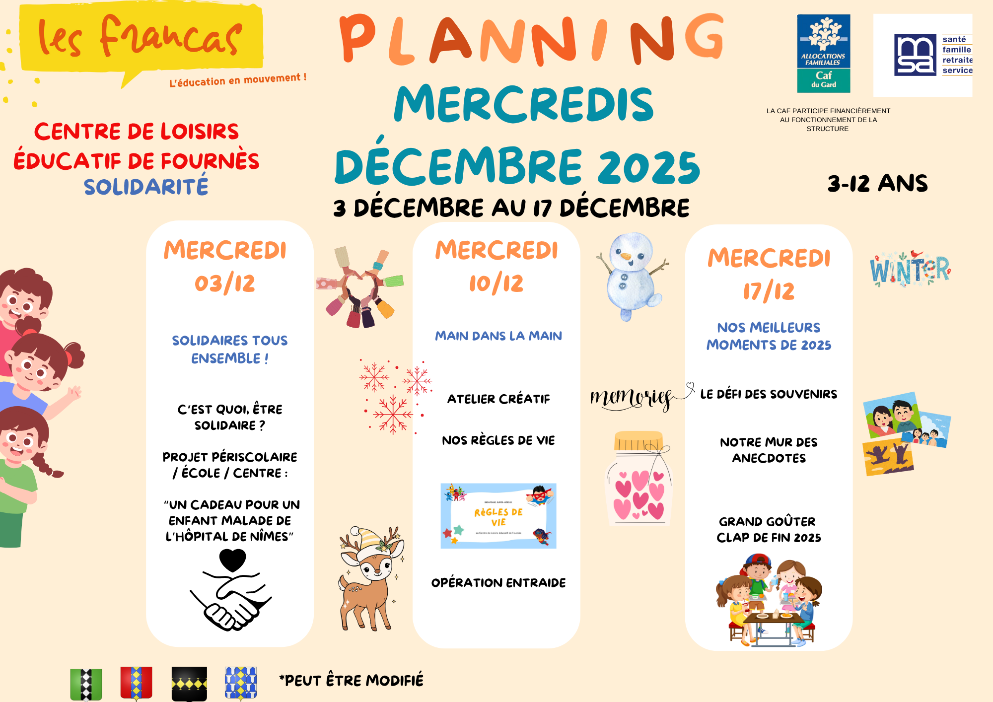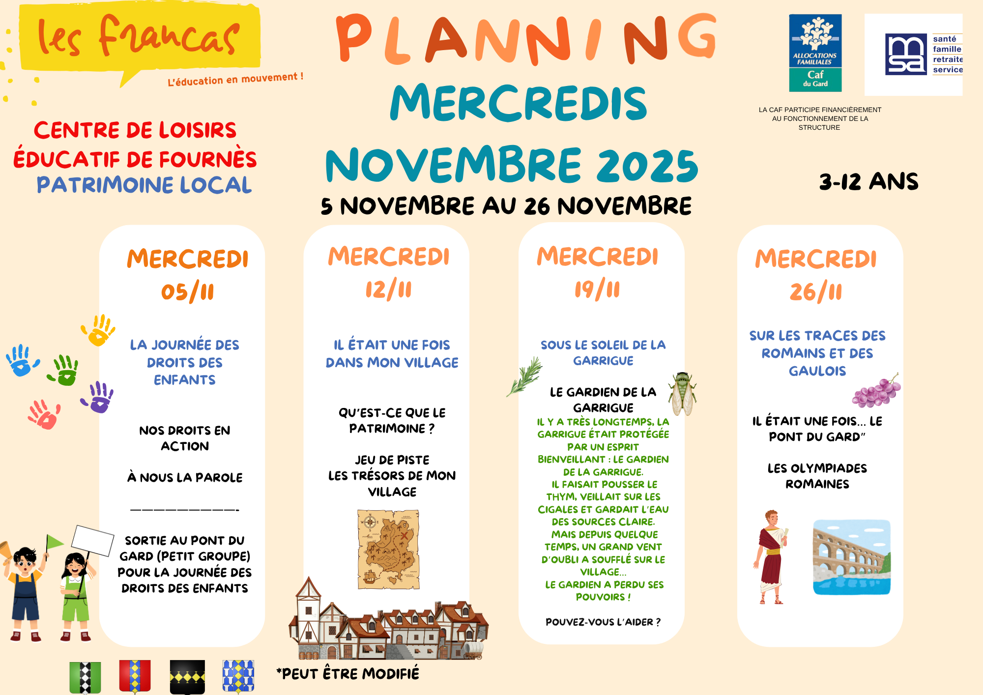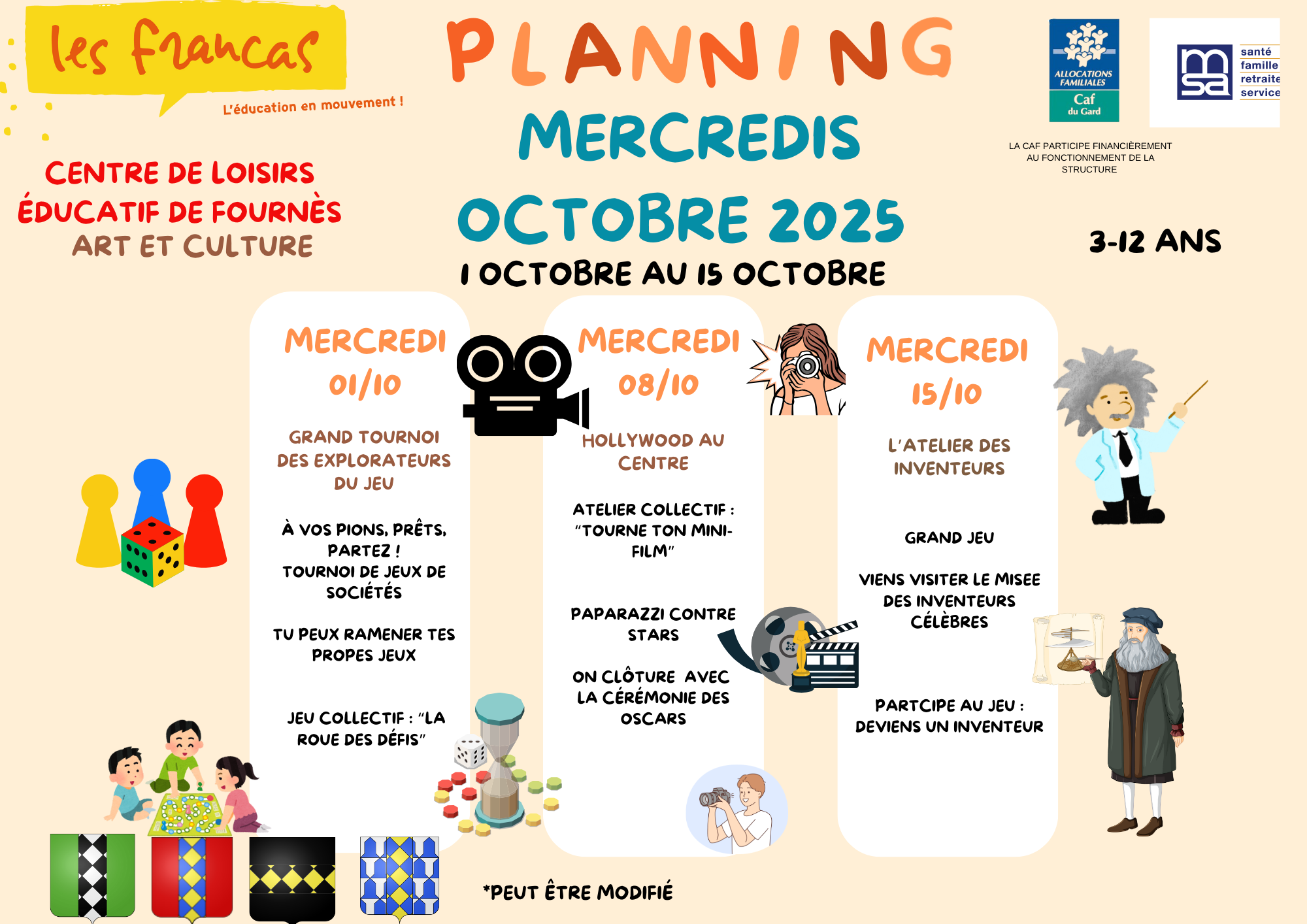 Le Centre de Loisirs Éducatif de Fournès est animé et géré par l’association départementale des Francas du Gard. Une équipe d’animation diplômée est disponible pour accueillir vos enfants à partir de 3 ans jusqu’au CM2. Le centre de loisirs permet aux enfants de s’amuser, découvrir, participer et expérimenter en toute sécurité au groupe scolaire des Aires Blanches sur la commune. Des espaces de jeux équipés et variés, encouragent la participation de tous les enfants par la découverte d’activités variées et ludiques en période scolaire tous les mercredis et durant les vacances scolaires (sauf vacances de fin d’année et le mois d’août) de 7h30 à 18h30.